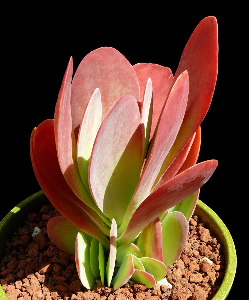 Crassula ovata, commonly known as the jade plant, is a succulent species within the Crassulaceae family, native to the subtropical regions of South Africa and Mozambique. This evergreen perennial shrub exhibits a compact, branching habit, typically reaching heights of 1–3 meters in optimal conditions. Morphologically, it is characterized by its thick, ovate, glabrous leaves with a glossy surface, which serve as reservoirs for water storage, an adaptation to arid environments. The stems are succulent and woody with age, often displaying a brown, bark-like texture. C. ovata employs Crassulacean Acid Metabolism (CAM) photosynthesis, a xerophytic adaptation that allows for gas exchange primarily during nighttime to reduce transpirational water loss.
