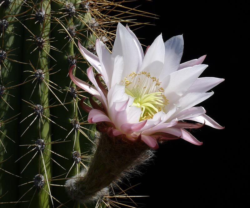 Echinopsis terscheckii, also known as the Argentine saguaro or cardón grande, produces large, striking flowers that bloom primarily in spring and early summer. These funnel-shaped blossoms are typically white and can reach up to 8 inches (20 cm) in diameter. They open at night and often remain open into the next morning, attracting nocturnal pollinators like moths and bats.