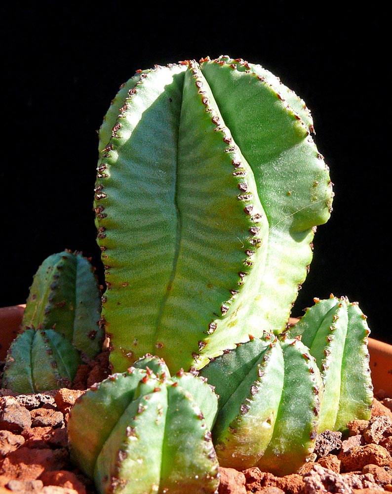 Euphorbia anoplia, commonly known as the Pancho Cactus, is a unique succulent native to South Africa. Despite its cactus-like appearance, it belongs to the Euphorbiaceae family and is not a true cactus. This compact, clump-forming species features ribbed, upright green stems with prominent vertical ridges and small, spine-like projections along the edges, giving it a visually striking, geometric look. The stems are typically 4–6 inches (10–15 cm) and may flush with red or purple hues in bright light or under stress. At the top of the stems, it produces small, reddish-purple cyathia (the characteristic Euphorbia floral structure), adding a delicate contrast to the rugged texture of the plant. (more…)