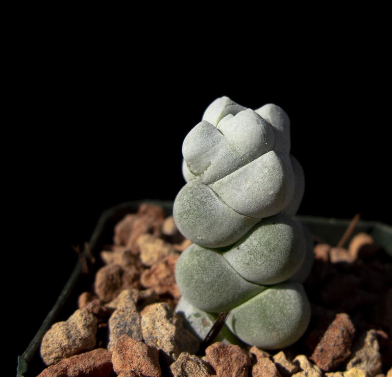 Crassula plegmatoides is a compact, dwarf succulent with unusual leaf pairs that are tightly stacked along a short stem, creating a segmented texture. The leaves are bluish-gray and often covered with a fine powdery bloom, helping to reduce water loss in its arid native habitat of South Africa. This slow-growing species remains small, typically forming dense, clustered mounds. In late winter to early spring, it may produce tiny, star-shaped white or pink flowers at the tip of its stems. (more…)