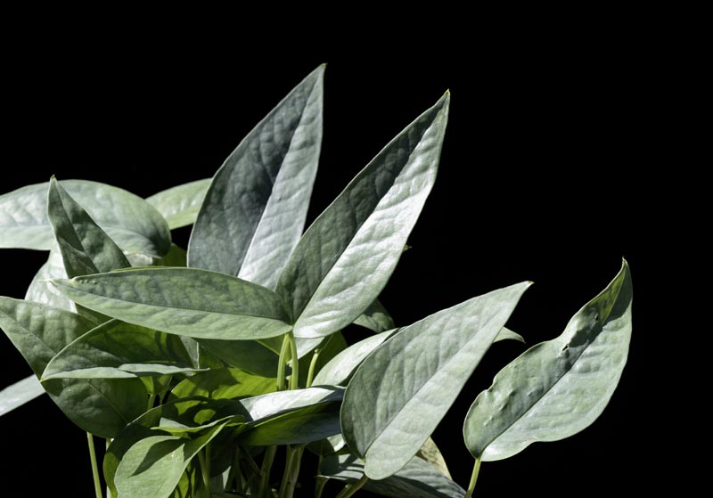 Pothos “Cebu Blue” is my favorite of the vining tropical houseplants. I like it for the foliage, those sharp blue leaves ready to poke any passersby.