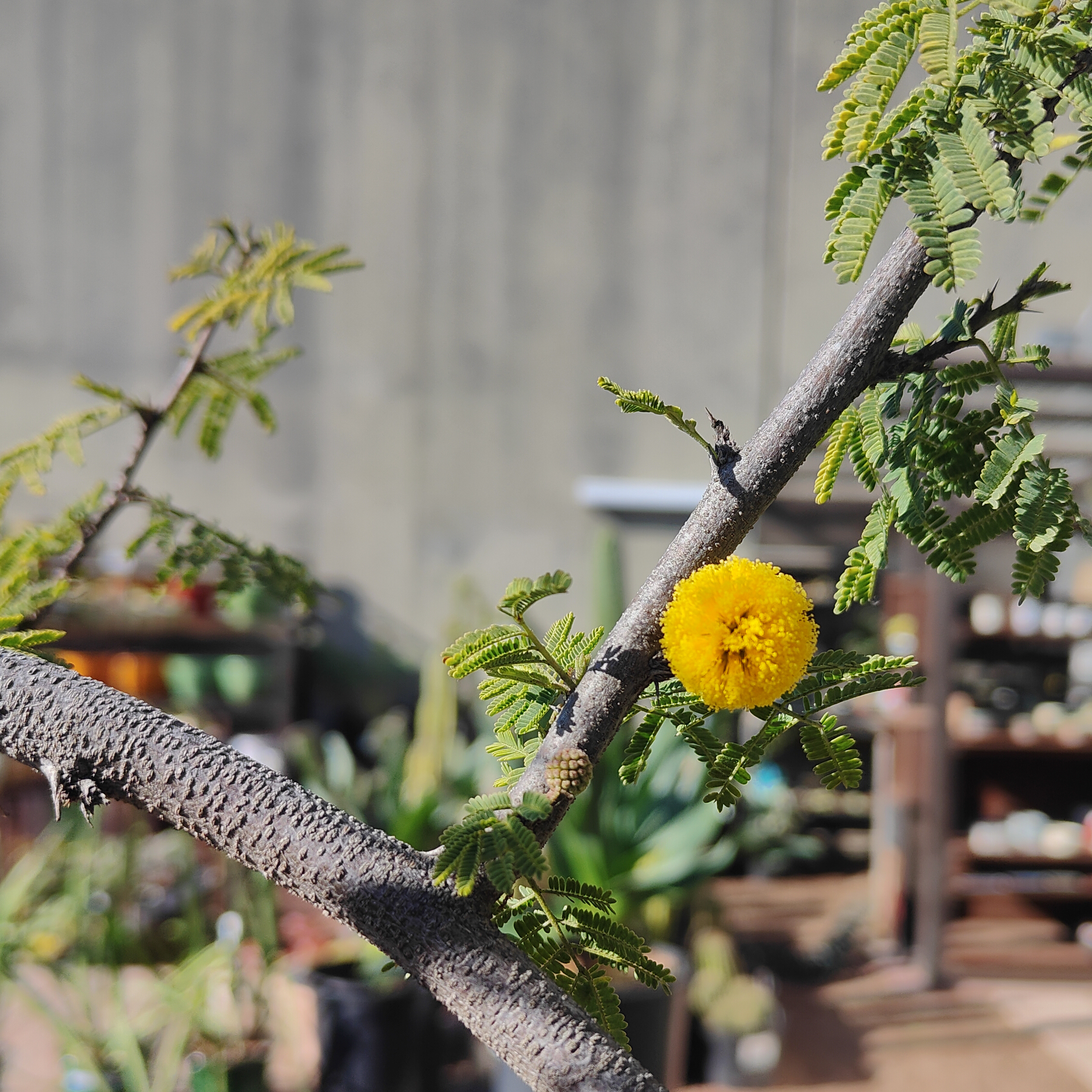 A cleaner variety than the species with few of the large brown seed pods. Beautiful moderate-sized spreading tree, 25ft tall with 25ft canopy when mature. Small pinnate leaves. Covered in scented yellow puffball flowers through the spring. Easy to grow, heat and cold tolerant.
