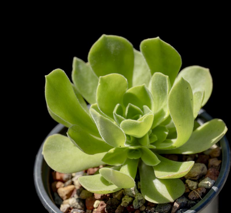 Does well outdoors in the bay area as a potted plant or landscape specimen. Plant in well draining media. This plant is from a winter rainfall region, but can receive water throughout the year in cultivation. Should be watered about once every 2 weeks, always allowing time for the soil to dry out between waterings. This plant does not like extreme heat and can fry if the temperatures rise above 100°F for long periods. Aeoniums are monocarpic so branches die back after flowering, but plants will generally re-branch from lower stems.