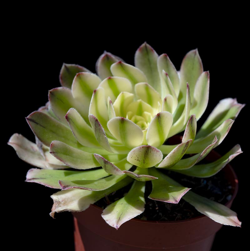 Does well outdoors in the bay area as a potted plant or landscape specimen. Plant in well draining media. This plant is from a winter rainfall region, but can receive water throughout the year in cultivation. Should be watered about once every 2 weeks, always allowing time for the soil to dry out between waterings. This plant does not like extreme heat and can fry if the temperatures rise above 100°F for long periods. Aeoniums are monocarpic so branches die back after flowering, but plants will generally re-branch from lower stems.