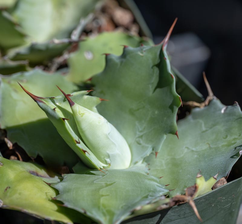 Rosettes to 18″. Scalloped blue leaves with prominent reddish terminal spine. Moderate water, full sun.