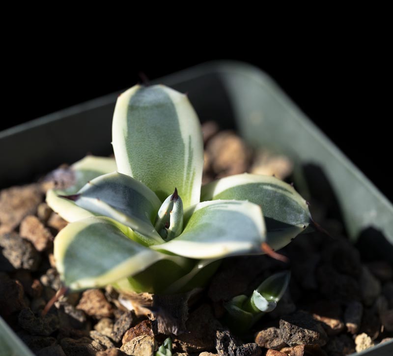 Small, thick-leaved hardy rosettes, yellow-striped, slow-growing