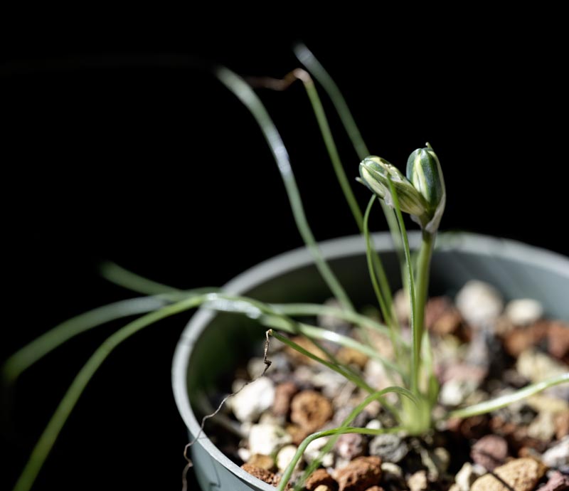 Small bulb with narrow channeled and semi-deciduous leaves that will curl at the ends. Produces long bloom stalks with whiteish-green flowers in the spring.