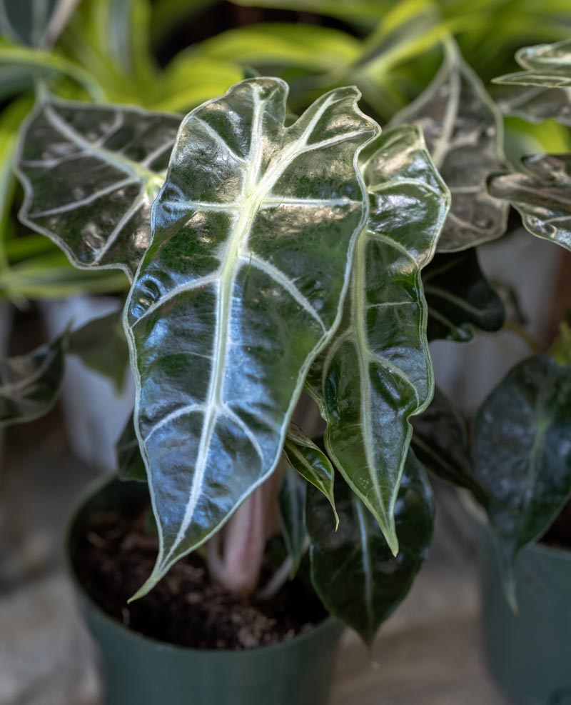 Large arrow-shaped leaves to 18″, dark and glossy green, wavy-edged and prominent white veins. Likes warm and humid. Tropical Houseplant can handle a variety of indoor light conditions, bright indirect is best. Fast draining soil, moderate water, some humidity.