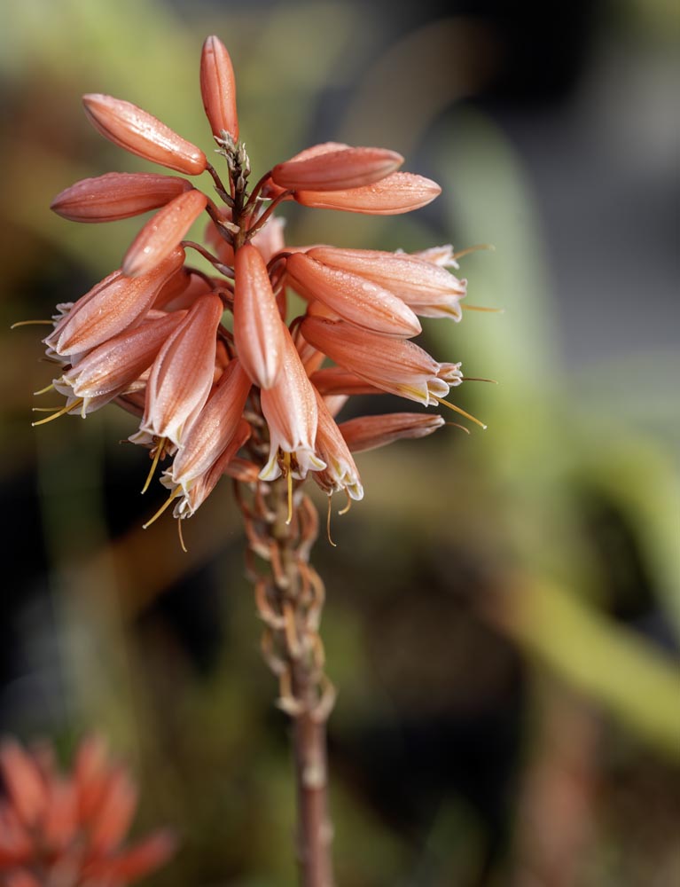 Mid size clustering aloe, thick toothy leaves, bright orange in summer sun. Striking bloom stalks rise above from summer thru winter with orange-red flowers.