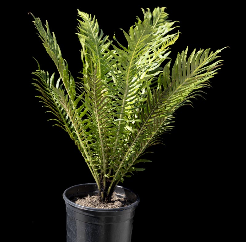 Green fronds, will develop a short trunk over time. Great for indoor or outside in a protected shady spot.