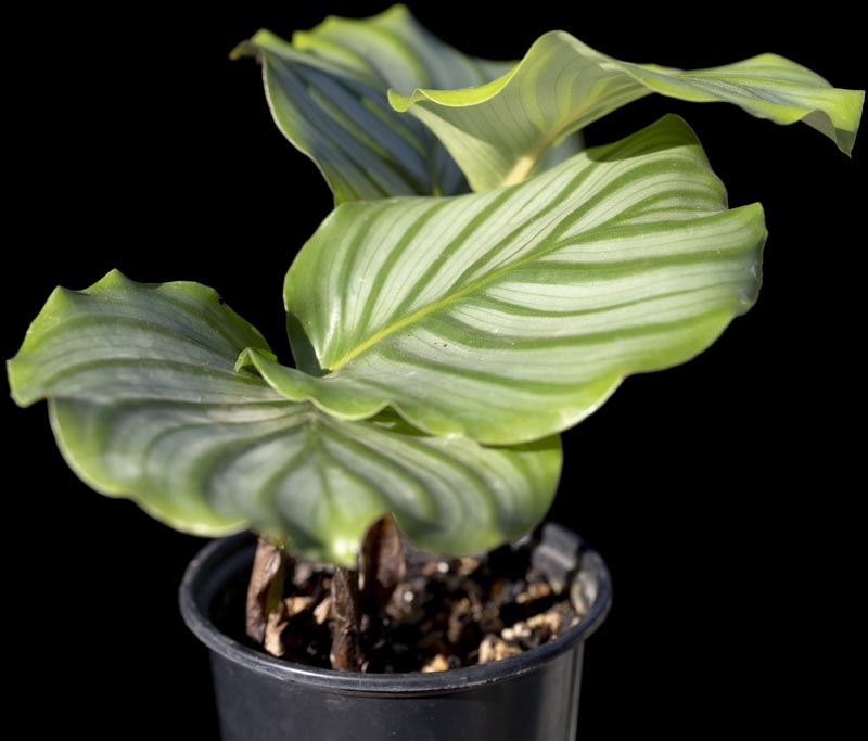 Large round striped green leaves. Tropical Houseplant can handle a variety of indoor light conditions, bright indirect is best. Fast draining soil, moderate (distilled) water but prefers not to sit in water. Occasionally mist the leaves.