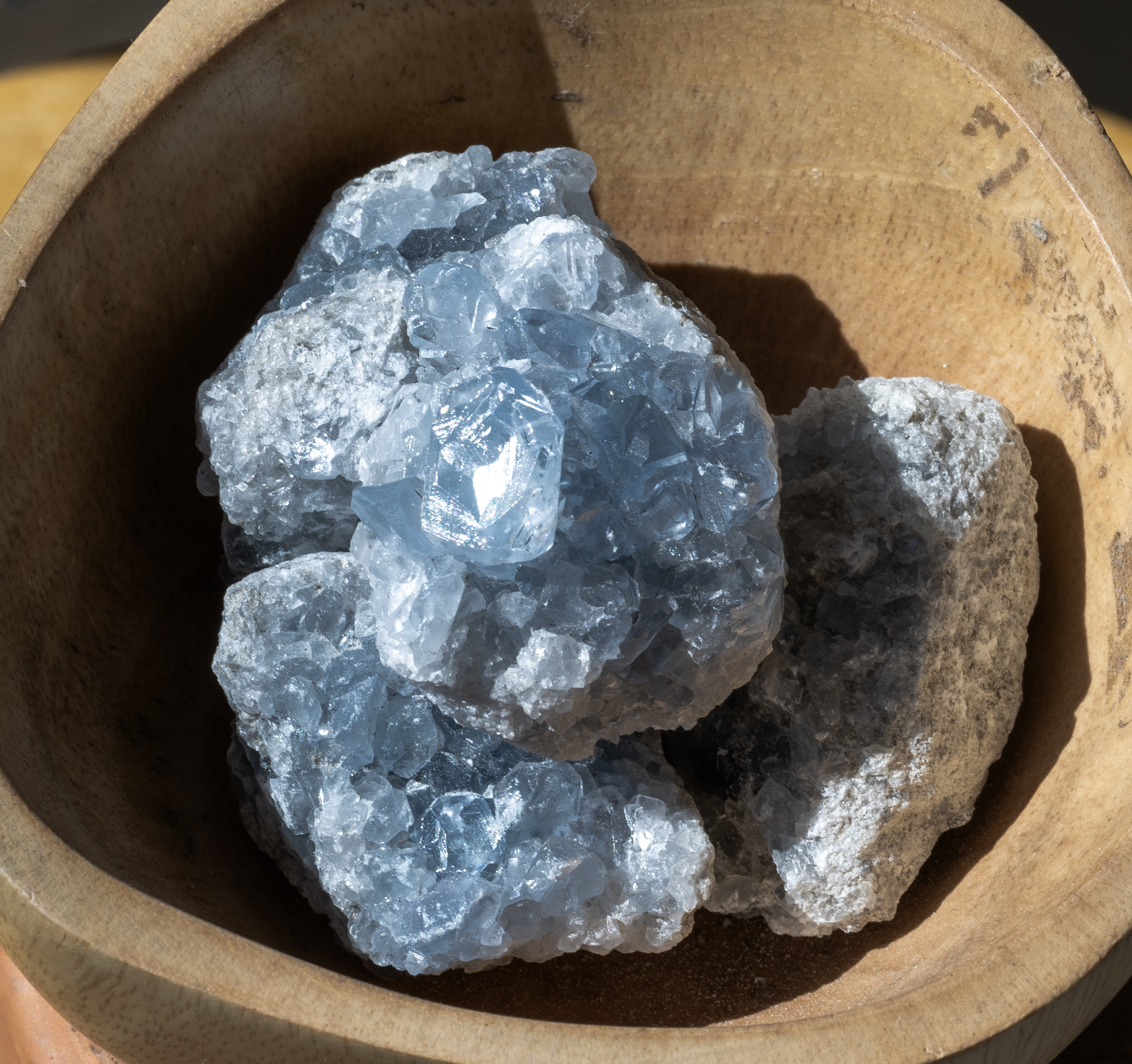 Also known as Celestine. Delicate blue crystals, a principal source of strontium for fireworks use.