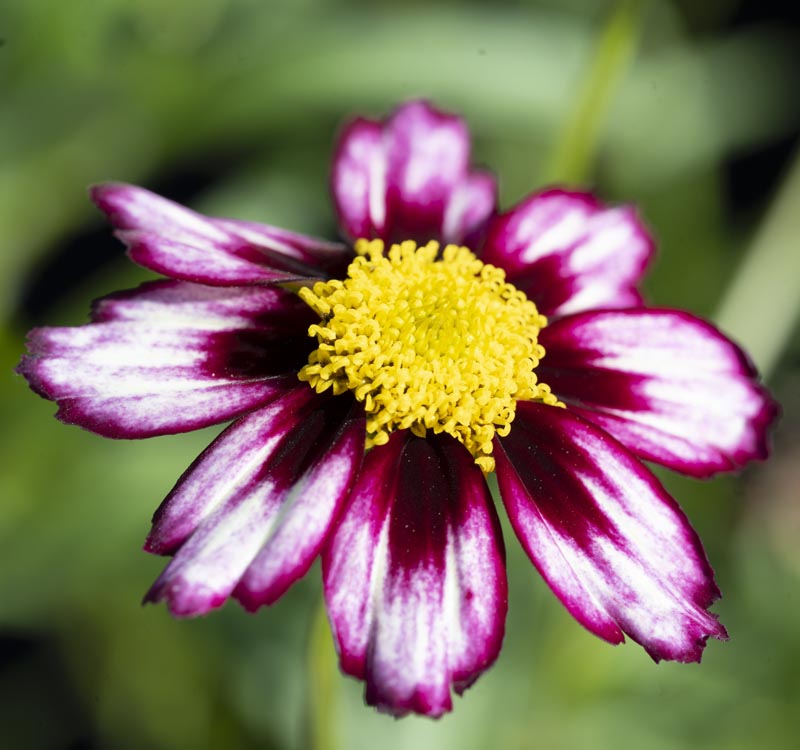 Blooms non-stop for months, can rebloom in winter. Bright daisy flowers with white petals, vivid purple streaks and yellow centers, more color in colder weather. Fernlike foliage forms a lacey/frilly mound. Classic garden plant, works well in containers.