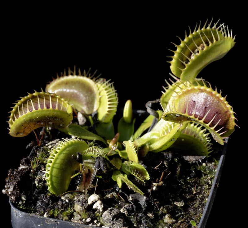 A stunning red-blush cultivar of the classic fly trap. Deeper red in the center of the traps. The petioles can reach 6″. Allow to slightly dry between waterings. No fertilizer.