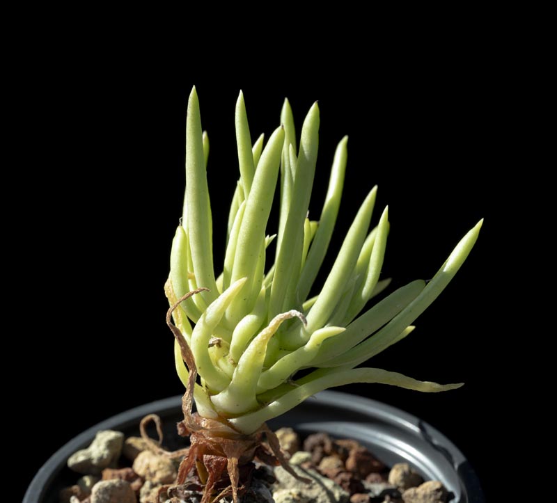 Tight clusters of green rosettes with slightly red tips in full sun. White flowers on long bloom stalks.