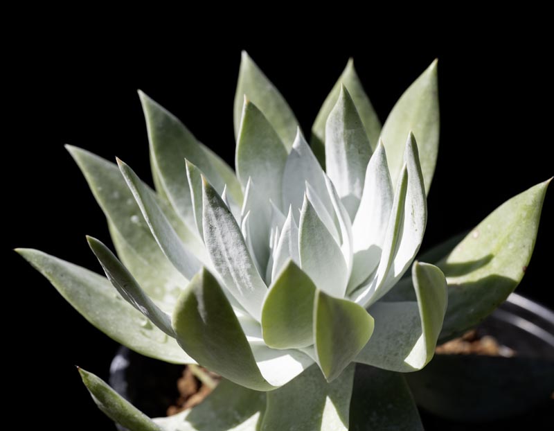 18″ rosettes on single stems with chalky leaves. Looks best if dry through the summer months – avoid overhead watering.