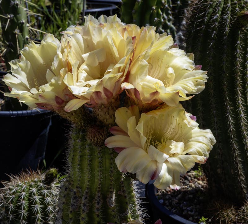 Echinopsis “Grandiflora Hybrids” – Hybrid Hedgehog cacti with dozens of large, fragrant blooms. They will have a large bloom flush in late spring or early summer, depending on when we get our first warm temperatures. They will also send out a few more blooms through the summer and can get a 2nd large flush in the fall.