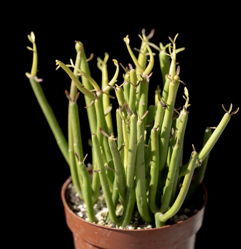 Pencil-like stems. Will grow to a fully branched 20ft. tall tree where hardy outside in the ground. Grows well indoor as a houseplant, 7 to 8 ft. tall. Red-tipped in full sun. The milky latext sap is poisonous and can cause skin irritation. One of the most poisonous houseplants. Keep away from children.