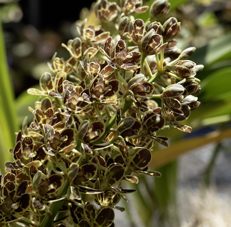 Large terrestrial orchid, 3 ft bloom spikes covered with spotted flowers. Grows 3 to 4 ft leaves from pseudobulbs. Protect from frost, keep under cover in winter. Morning sun is best.