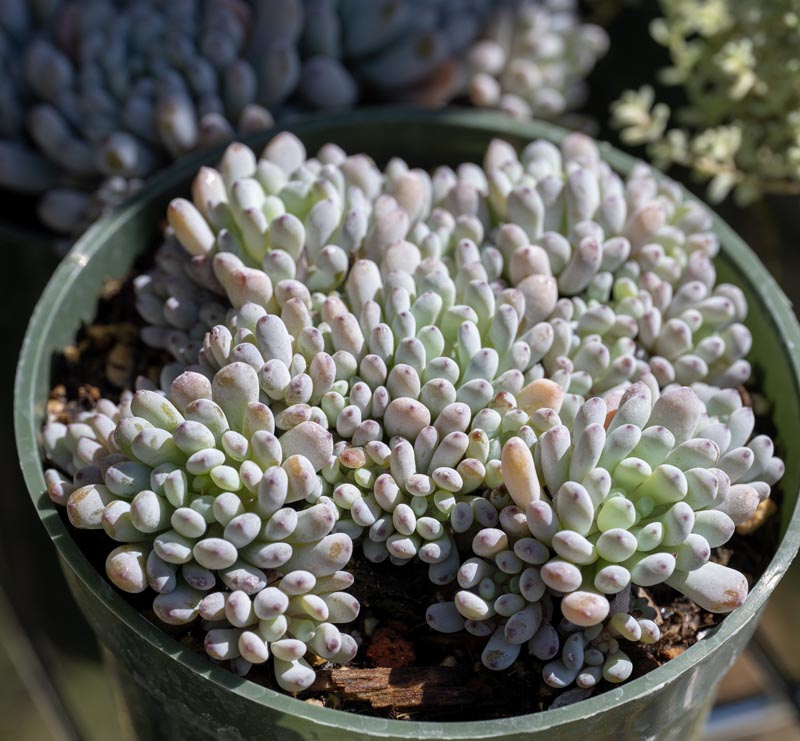 Colorful small rosettes with many small ovate leaves, mat-forming on trailing stems with bright yellow flowers in spring. This vigorous succulent also works well in hanging baskets or rock gardens as the stems will cascade with age.