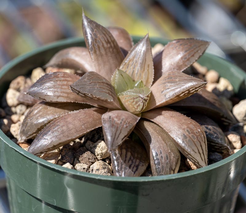 Haworthia “Ruby Crown” Other Images: Origin: South Africa Description: H. cooperi “Ruby Crown” Large bright windowed leaves with red veins. Characteristics: Temperature: Hardy to 25F Part Shade Ultra Soil Blend Low Water Size: 8" Other Images: