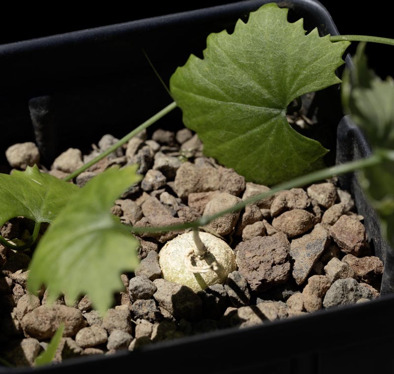 Large white caudex, annual vines, dormant in winter. Vines have long tendrils, small yellow flowers and red berries.