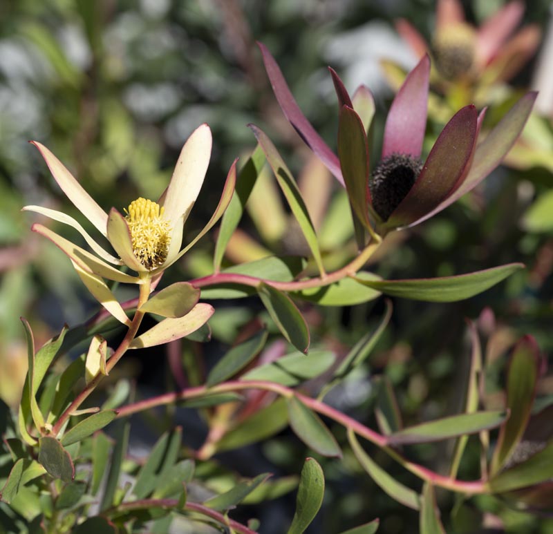 Red-tipped leaves in summer, reddish stems; gets covered in moderately large yellow cone flowers in late winter.