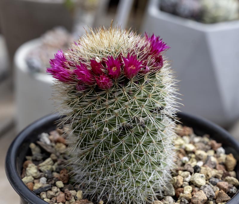 Usually solitary. Cylindrical to 12″h. Short pyramidal tubercles, not woolly. Crown of small bright pink flowers.