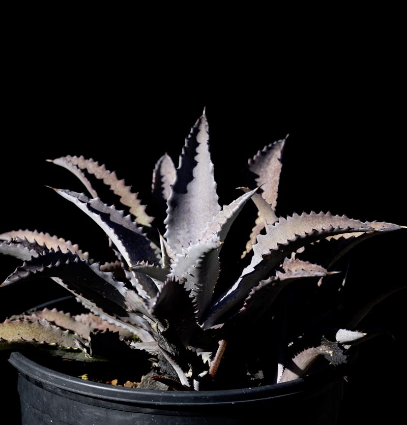 Thick arching blue green leaves freckled with purple spots. In full sun the leaves’ waxy coating will look silvery white, less pronounced with part sun. Great in containers. Deer resistant.