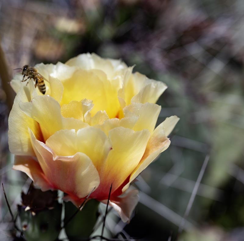 Black spines, 4-8″ long, purple pads, low spreading, populations vary.