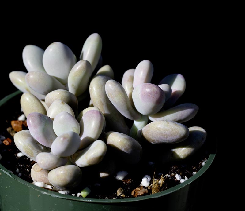 2″ globose leaves on short stems, bluish white with hints of purple in full sun. Red flowers