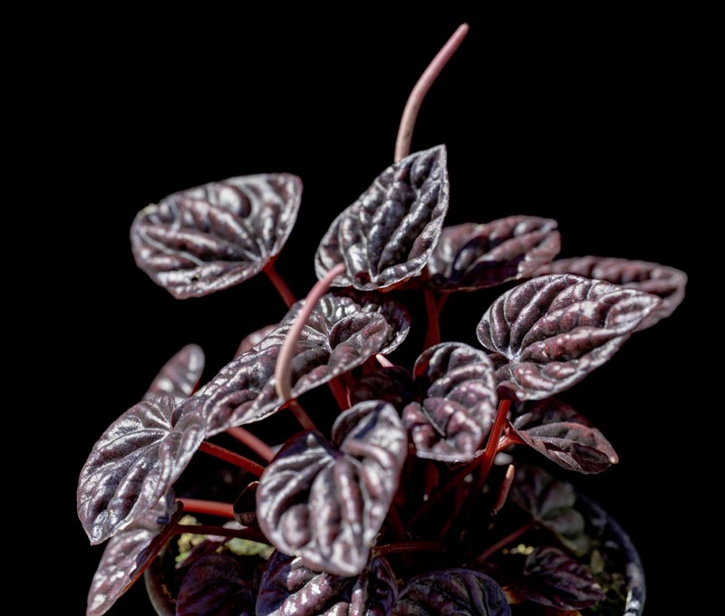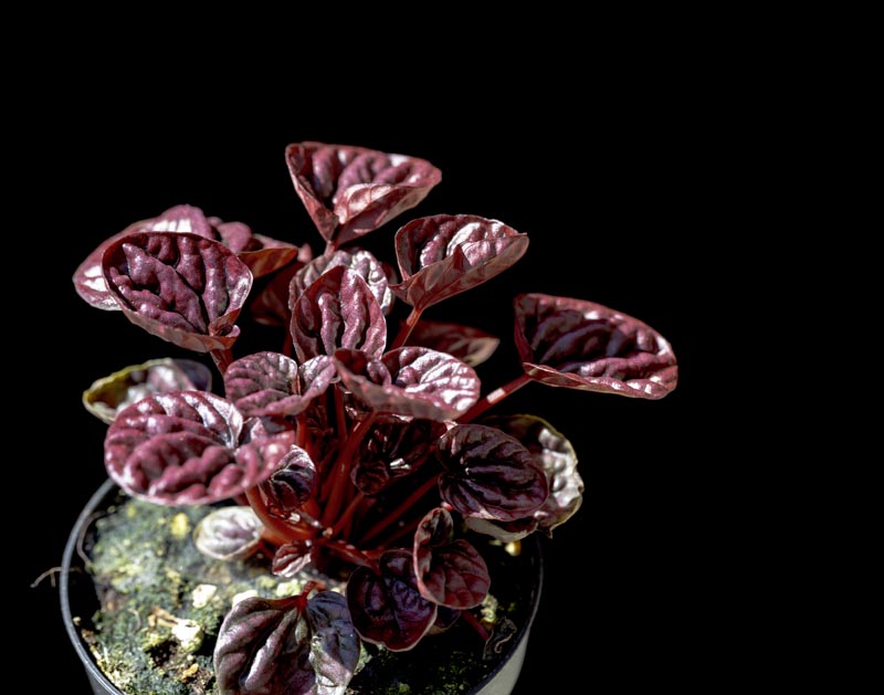 Stunning dark purplish-red to bright red crinkly heart-shaped leaves. Compact growth. Tropical Houseplant can handle a variety of indoor light conditions, bright indirect is best. Fast draining soil, moderate (distilled) water but prefers not to sit in water.