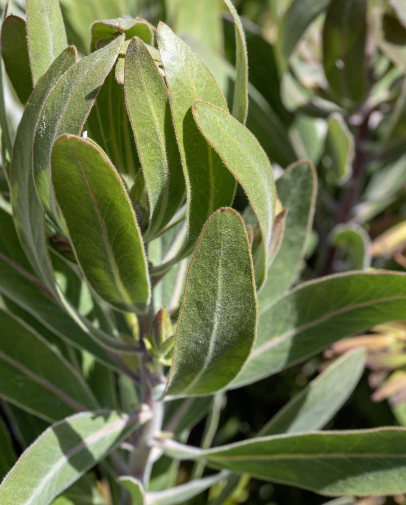 Upright shrub with silvery rose bracts that enclose the white flowers. Needs very good drainage. Do not fertilize, except trace minerals. Spectactular but short-lived.