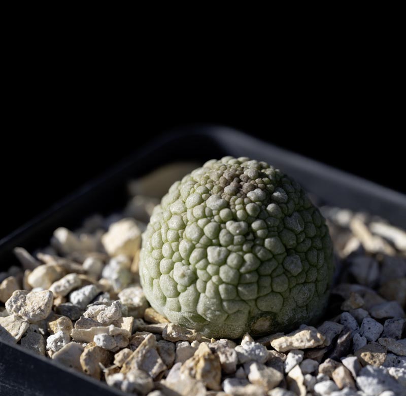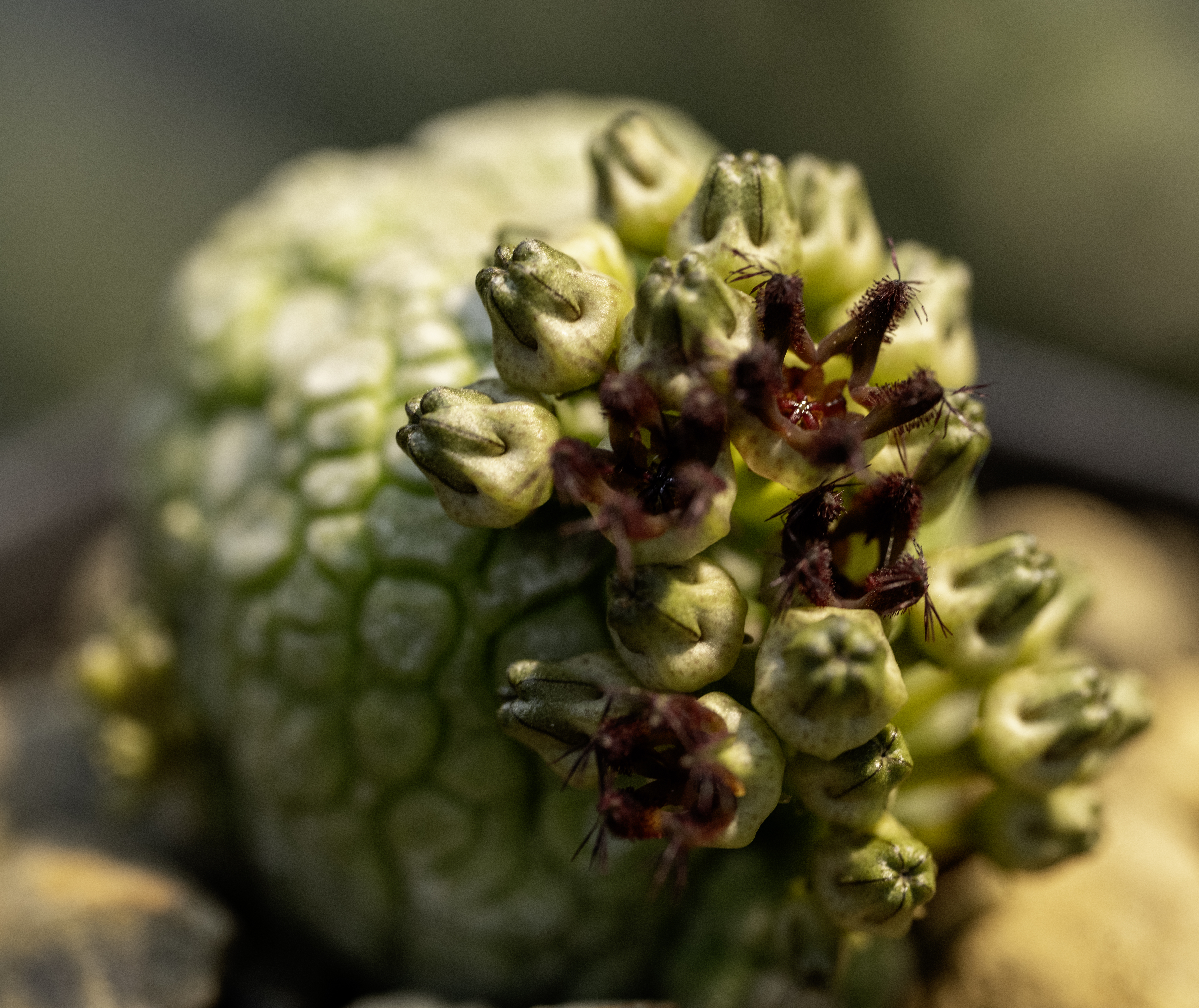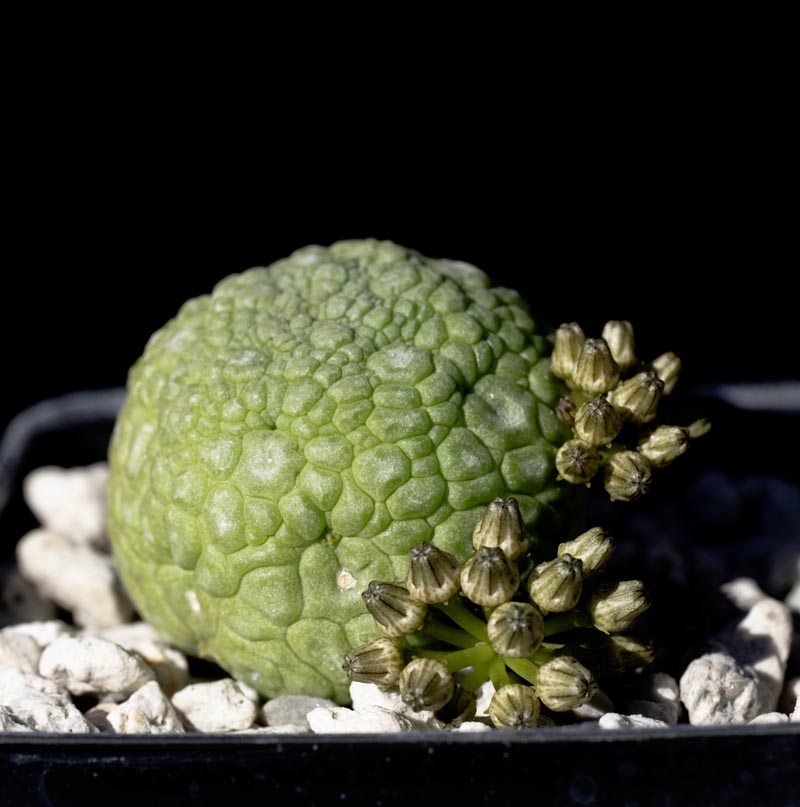 Rare Stapeliad with stunning clusters of small burgundy flowers. Blob-like plant will form a slight column and can even branch. Watering is tricky – regular water in summer when hot and sunny, lower water in winter but not none – do not over or under water!