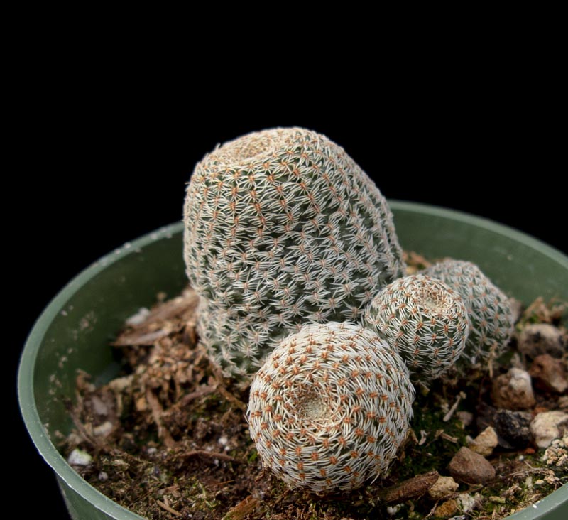 Clumping small 2″ barrels with orange blooms in spring. Very distinctive with silver white spines. Stems grow only a few inches tall.
