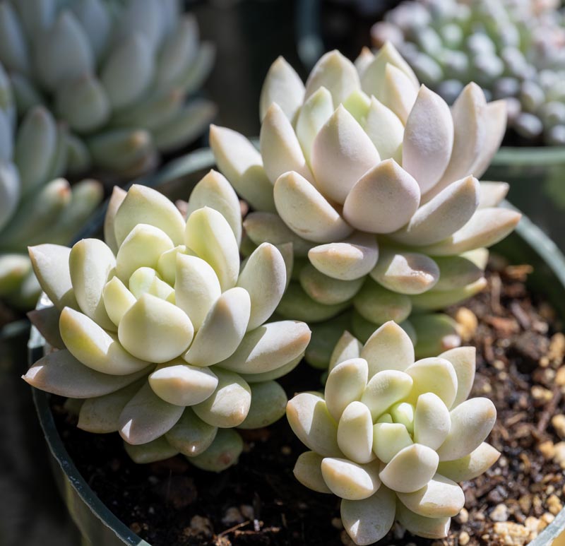 Sedeveria “Lilac Mist” Other Images: Origin: Mexico Description: Intergenic Hybrid. Thick grey-green leaves will blush lilac in full sun, rosettes to 6″ Characteristics: Temperature: Hardy to 25F Full Sun to Part Sun Ultra Soil Blend Low Water Other Images: