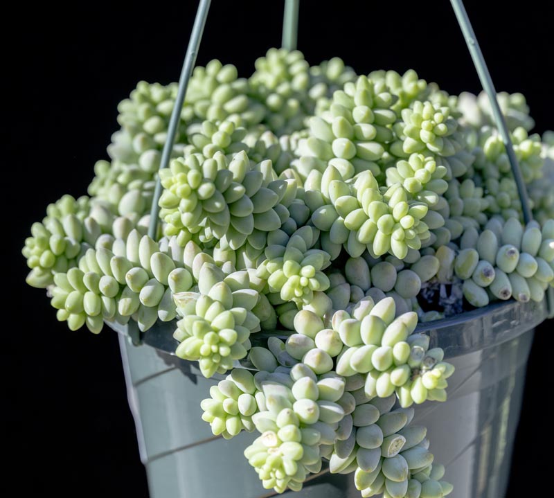Sedum burrito Other Images: Common Name: Burro's Tail Origin: Mexico Description: S. morganianum “Burrito” Pendant evergreen stonecrop w/small thick leaves, pink blooms Characteristics: Temperature: Hardy to 25F Full Sun to Part Sun Ultra Soil Blend Low Water Other Images: