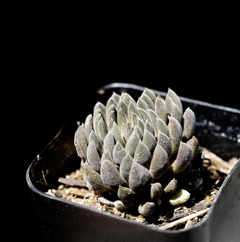 Small dark rosettes will form small clusters. Small rounded leaves. Bloom stalks appear above the rosettes, small white flowers. Very cold hardy, keep dry in winter. Grow best with moderate sun, can handle full sun or even light shade.